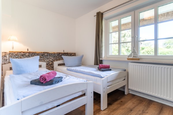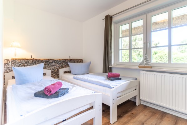Zwei Schlafzimmer. Ein Doppelbett, zwei Einzelbetten.