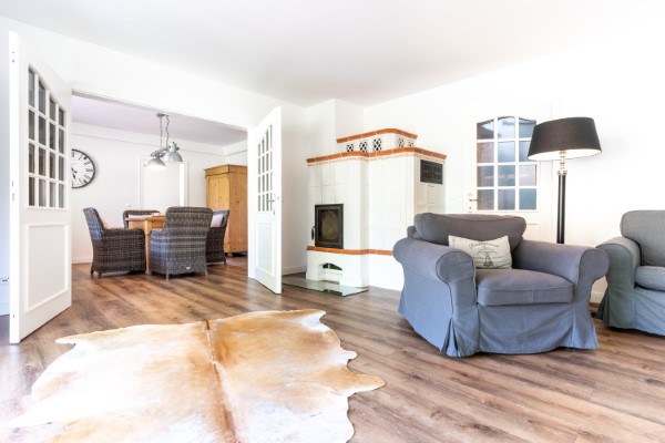 Die 2 separaten Schlafzimmer sind mit einem Doppelbett und 2 Einzelbetten ausgestattet. Ein Bad mit Eckbadewanne sowie Dusche, eine Küche mit Essbereich sowie einem geräumigen Wohnzimmer und Kachelofen bieten ausreichend Platz für die ganze Familie.