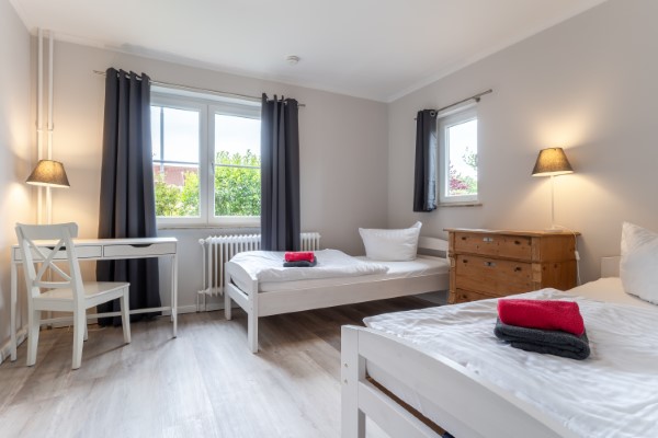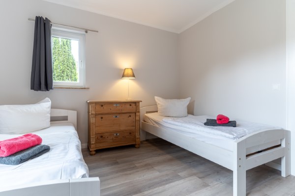 Zwei Schlafzimmer. Ein Doppelbett, zwei Einzelbetten.